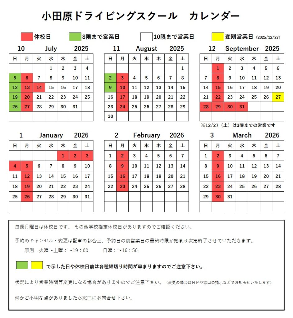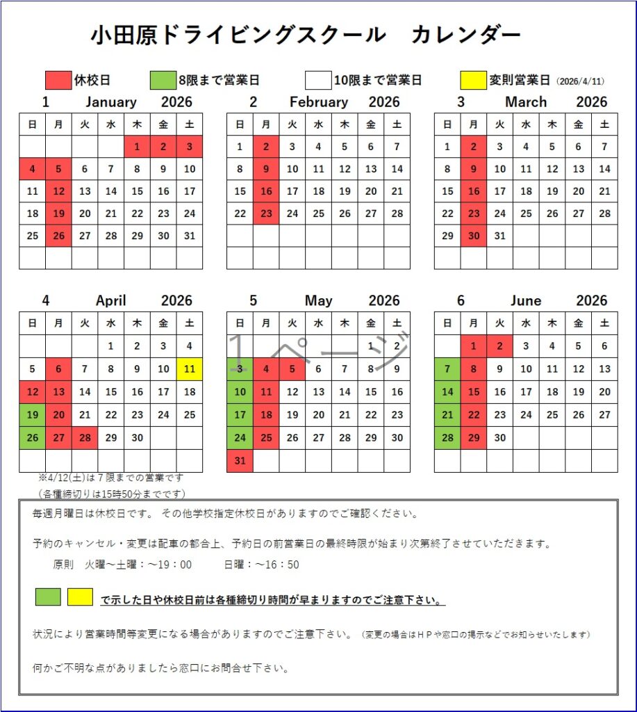 カレンダー 営業時間 定休日 月曜日火曜日~土曜日8:40~19:50日曜日8:40~17:40※イベントや年末年始、変則営業日、臨時休業等あり。※窓口業務(入校手続き等)は各日営業終了50分前で終了します。 教習時間 ※月曜日は定休日です。 ※日曜日の営業は8時限目までとなります。