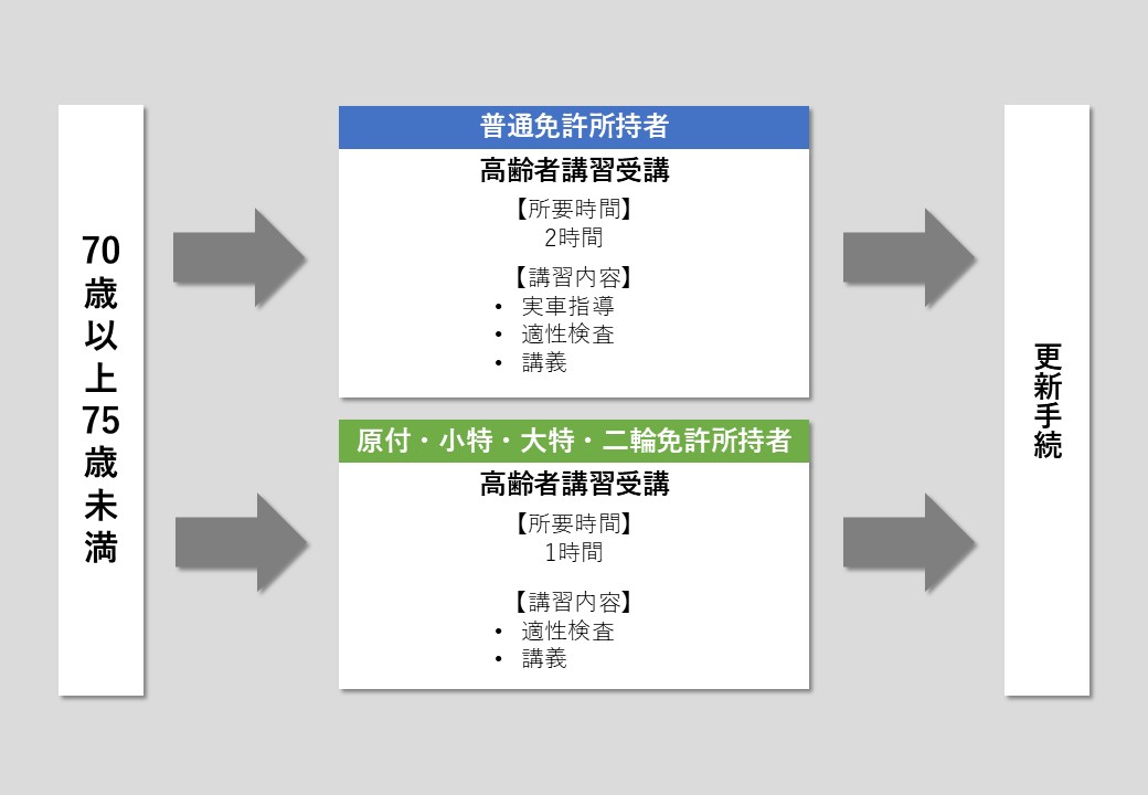 高齢者講習 | 2時間 70歳以上で普通車が運転できる免許(普通免許等)をお持ちの方。 (運転技能検査の対象でない方) |